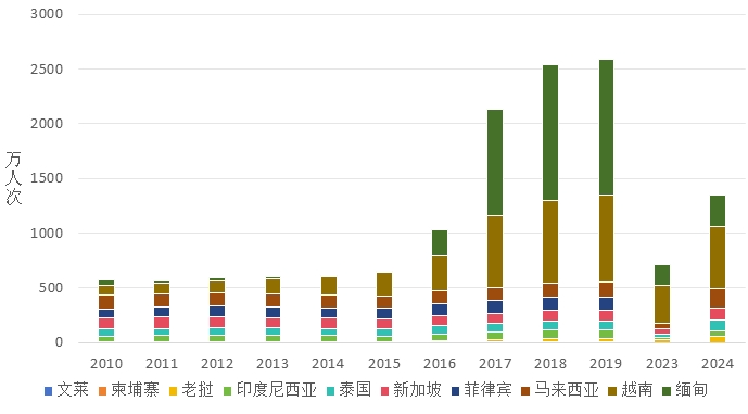 注:疫情期间数据不显示;2023-2024年,文莱、柬埔寨和菲律宾来华旅游数据缺失;2016年以后入境旅游统计数据包括边境旅游。